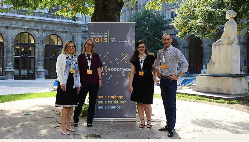 Das "grüne Team" v.li.n.re.: Pamela Stückler von der Universitätsbibliothek, Margarethe Jurenitsch vom Veranstaltungsmanagement, Hannah Windbichler vom Team Öffentlichkeitsarbeit der Universitätsbibliothek und Green Meeting Beauftragter Gerry Schneider vom Veranstaltungsmanagement.