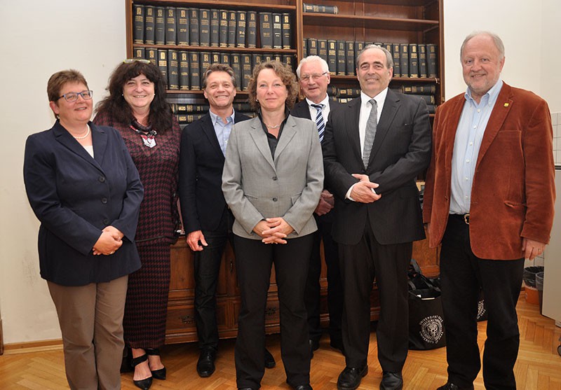 Historikerin Renate Pieper, die Executives Carmen Schoberwalter-Jöstl, Gert Pfleger, Andrea Schulze-Moews, Bernhard Stefan Kirchhoff, Werner Reineke und GEWI-Studiendekan Helmut Eberhart (v.l.). Foto: Uni Graz/Kastrun.