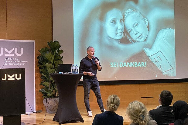 Vortrag von Stefan Süß - Wie man trotz Krisen glücklich ist, erklärte Stefan Süß bei einem Vortrag an der JKU. Stefan Süß (Speaker und Kommunikator) motivierte und begeisterte mit seinem Vortrag für den Verein Campus 4. Verein zur Förderung der Campuskultur zum Thema ,, Zufriedenheit und Wachstum, auch in herausfordernden Zeiten " rund 50 Besucher*innen. Mit einem Leitsatz wie etwa: ,, Glück ist die Akzeptanz dessen, was ist." vermittelte er in einem 90-minütigen Vortrag die unabdingbaren Werte des Lebens, die vielleicht schon etwas in Vergessenheit geraten sind. Der Eintritt war frei, die freiwilligen Spenden kommen der MORE-Initiative für geflüchtete und vertriebene Studierende zugute. Dem schloss sich auch der Vortragende an und spendete sein Honorar für die Initiative.
