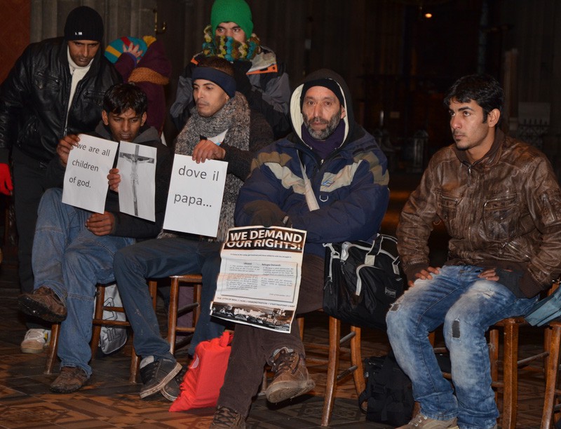 Im Rahmen der Refugee-Proteste im Winter 2012 wurde unter anderem die Votivkirche in Wien besetzt, hier ein Foto von Aktivisten aus der Kirche vom 18. Dezember 2012.
