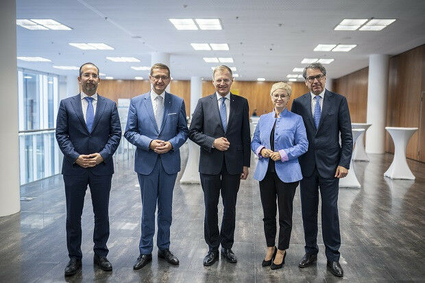 V.l.: Univ.- Teodoro Cocca, Johannes Kepler Universität Linz, Wirtschafts- und Forschungs-Landesrat Markus Achleitner, Landeshauptmann Mag. Thomas Stelzer, Mag.a Doris Hummer, Präsidentin der Wirtschaftskammer OÖ, und DI Stefan Pierer, Präsident der Industriellenvereinigung OÖ.