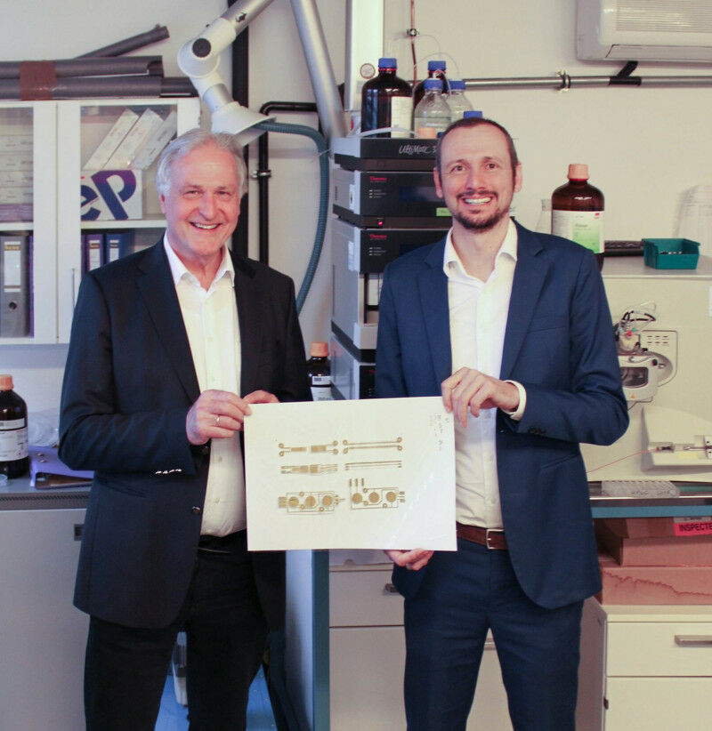 Univ.- Thomas Grießer (re.) freut sich gemeinsam mit Vizerektor Peter Moser über das neue Zentrum für digitale Drucktechnologien.